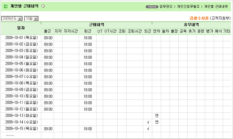 월별근태집계는 개인별 근태집계, 개인별 근태내역, 개인별 휴무내역, 부서별 근태집계 페이지로 구성되어 있습니다. 각 페이지는 다음과 같이 구성되어 있습니다.