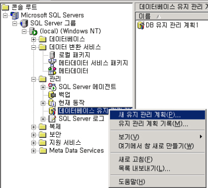 local(WIndosNT) > 관리 > 데이터베이스 유지 관리 계획에서 오른쪽 마우스 클릭 > 새 유지 관리 계획
