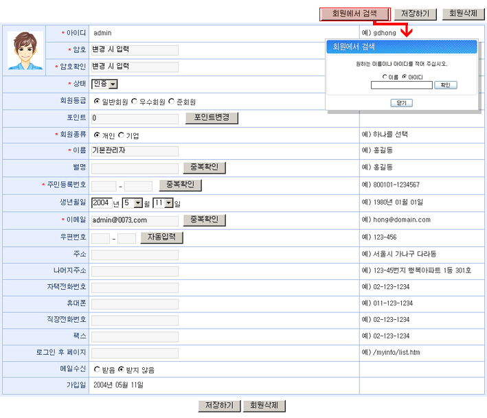특정 회원의 정보를 관리자가 직접 수정할 수 있습니다. 회원에서 검색을 누르면 특정회원 검색이 가능합니다.