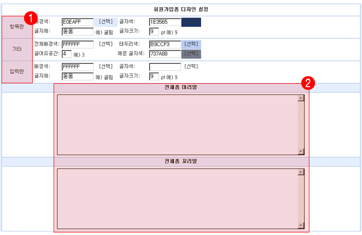 1. 항목란/기타/입력란 : 배경색, 글자색, 글자체, 글자크기를 설정할 수 있습니다.