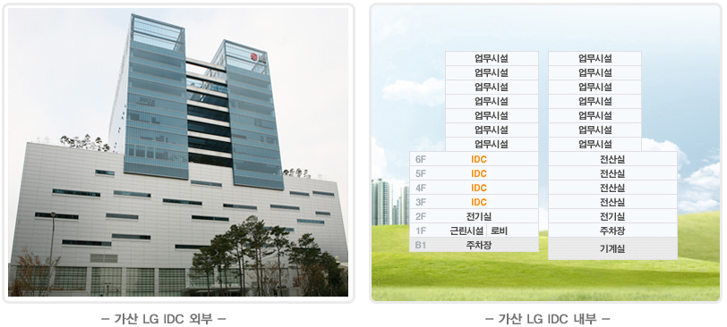 | 가산 LG IDC는 국내 IT 랜드마크 LG데이콤 IDC 위상에 상응하는 국내 최대 규모(지하 1층, 지상 13층, 연면적 75,040m2)의 센터이며 타 IDC 업체 건물에 비해 월등한 시설로서 항온항습 설비의 Redundancy 구성, 대용량 전력공급 및 대용량 효율 냉각 시스템 등 최첨단 시설이 완비되어 있습니다. |