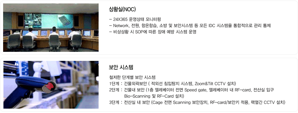 | 가산 LG IDC의 보안 센터는 상황실 통제 아래 3단계 보안이라는 첨단 보안 센터를 운영 중에 있으며 RFID 시스템을 통한 철저한 모니터링 및 신속한 대응을 목표로 하고 있습니다. |